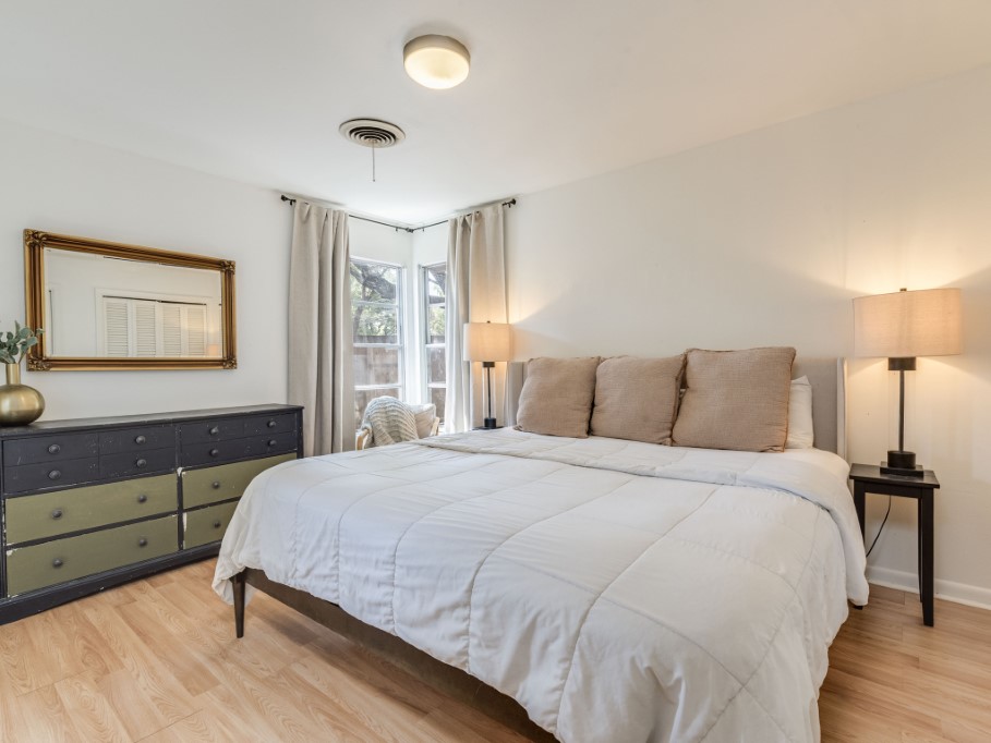 Take a walk inside this 3 bedroom home in an established North Austin neighborhood. As soon as you pull up you will notice charming curb appeal and gorgeous Crape Myrtle trees in the front yard. The private, fully fenced backyard is an entertainer’s dream boasting mature oak trees, a fire pit, horse shoe pit, lounge swing, concrete table, and plenty of yard space for the dogs and kids to play. Have your family and friends over to create the memories that last a lifetime. The converted garage adds an additional flex space that you can transform into a home office, hobby space, or storage area. The home has upgraded wiring and electrical panel to ensure safety and efficiency (2021), HVAC less than 2 years old, Water Heater 5 years old, Luxury Vinyl Flooring in living area (2021) that comes with a 10 year warranty, and new bathroom flooring (2023). Did I mention location Convenience?Easy access to North Lamar, I35, and the 183. Crestview Station is 5 minute drive that can take you to Downtown Austin, Q2 Stadium, the Domain, and other destinations so you do not have to fight traffic.